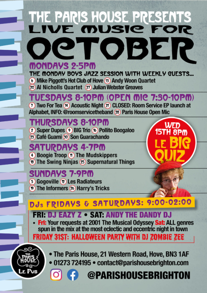 Our Sister Pub The Paris House also presents lots of live music. Here is their programme for October.