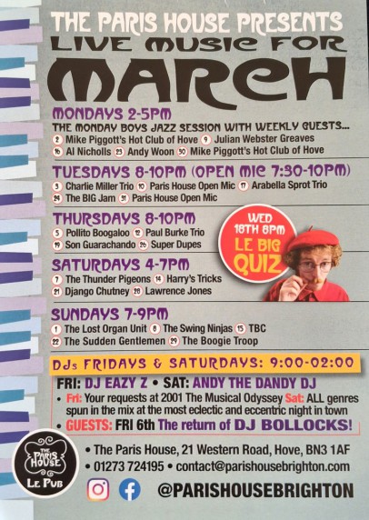 Our Sister Pub The Paris House also presents lots of live music. Here is their programme for November.