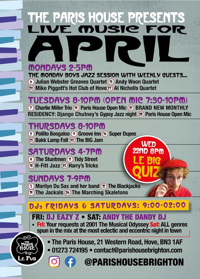 Our Sister Pub The Paris House also presents lots of live music. Here is their programme for March.